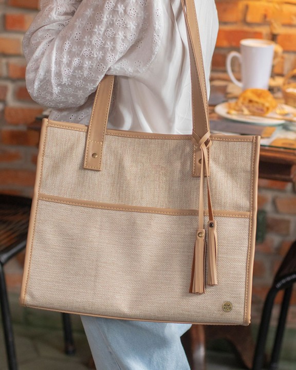 Cuenta con tres bolsillos internos, uno con cierre y un bolsillo plano externo con broche. Cuerpo en tela tapizada combinado con cuerina en los bordes, tira y aplique de pom pom.